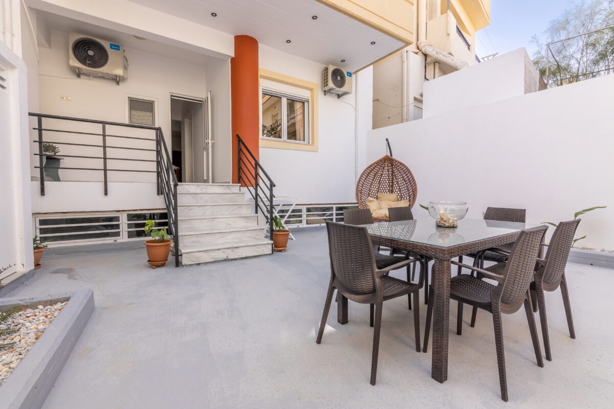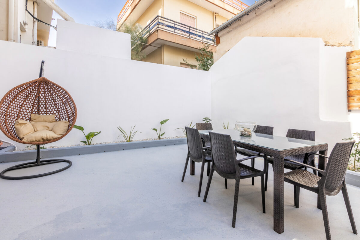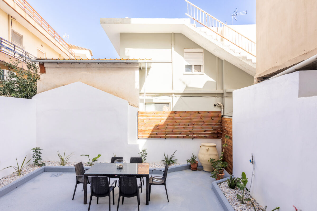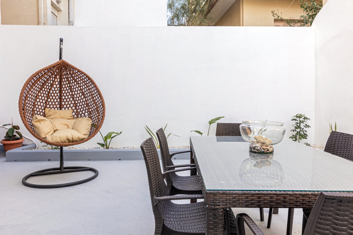 Step outside to your private garden courtyard, perfect for enjoying Crete’s sunshine. Relax at the outdoor dining area or on the charming hanging swing.